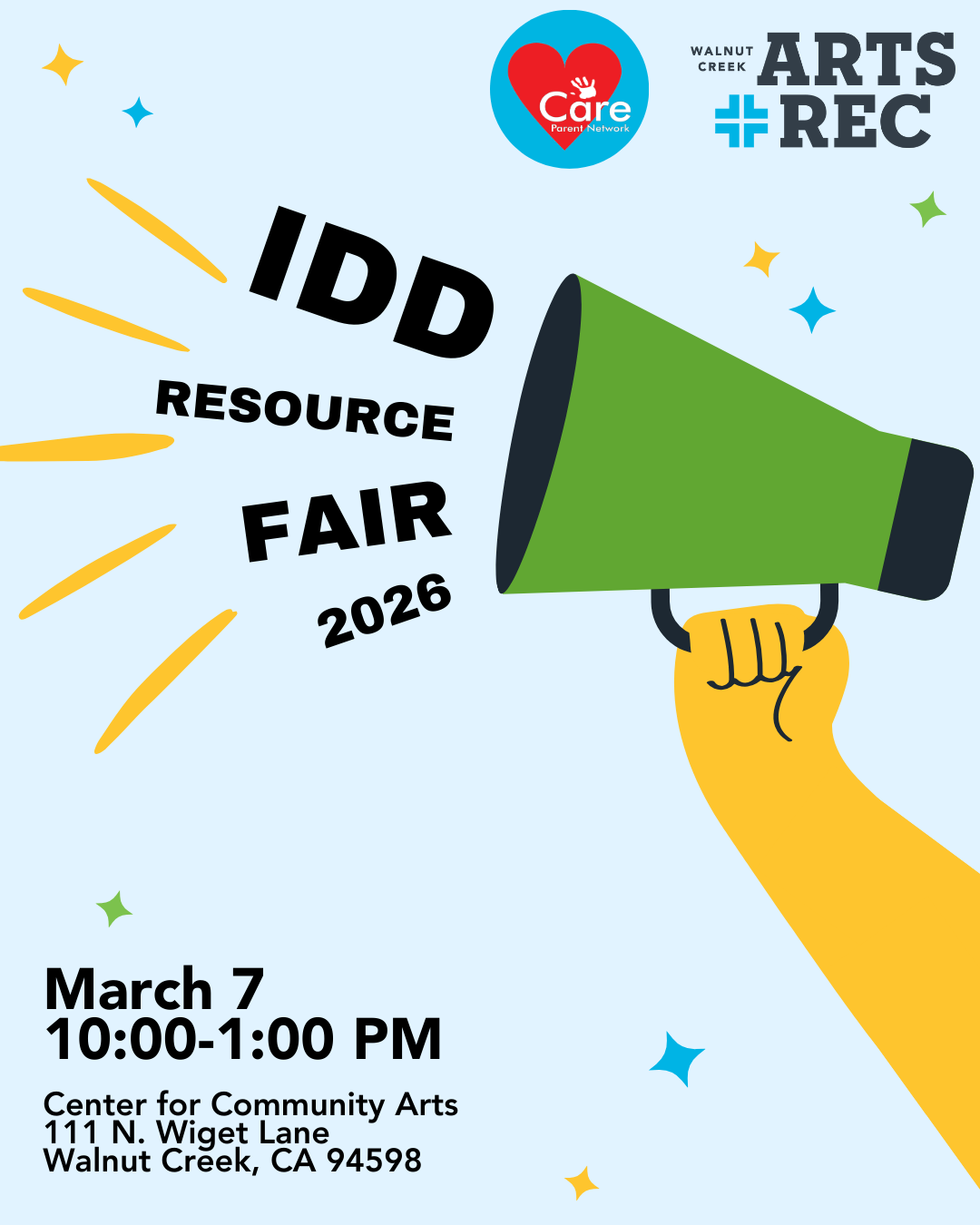 In partnership with Care Parent Network, the City of Walnut Creek will be hosting our second IDD Resource Fair to celebrate Developmental Disabilities Awareness Month on March 7th from 10:00 AM to 1:00 PM. Attendees will have the opportunity to learn about the various services available throughout the East Bay, speak with experts from each organization, and engage with other members and care providers from the IDD community.